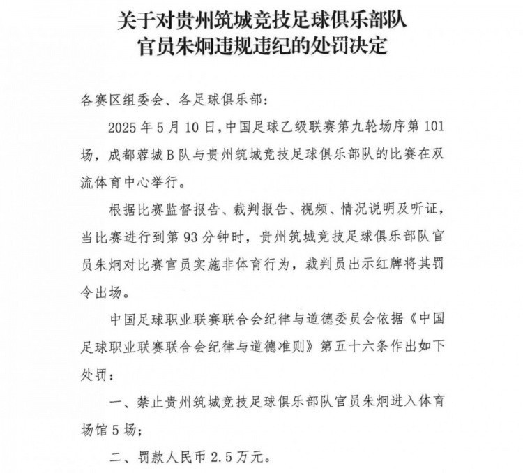 恰是因为裁判莫得暗示,贵州队主帅朱炯怒了。况兼有球迷泄露,现场那时两边球迷齐在骂裁判为什么不吹停。在中足联公布的料理决定中,关于朱炯的四肢原话是这么说的:贵州筑城竞技足球俱乐部队官员朱炯队比赛官员实践非体育四肢,评判员出示红牌将其罚令出场。最终中足联次序与说念德委员会依据相关规章,对朱炯处以禁赛五场,罚金2.5万元的料理。