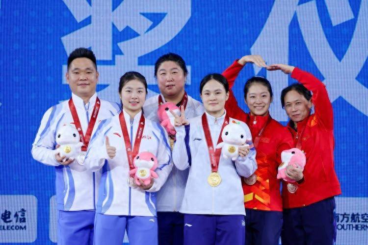 罗小敏(右二)获取十五运会举重女子59公斤级季军。